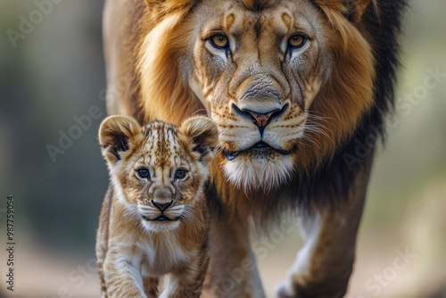 © Minerva Studio, Fototapeta premium Lion and cub walking in the wild