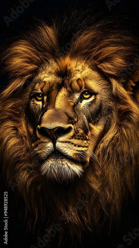 Fototapeta premium Lion Close-up Looking Up on Black Background, Abstract Image, Texture, Pattern, Wallpaper, Cover and Screen of Smartphone, PC, Laptop, 9:16 and 16:9 Format