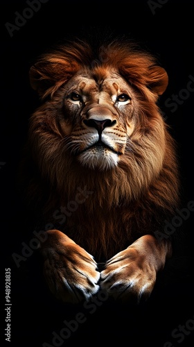 Fototapeta premium Lion Close-up Looking Up on Black Background, Abstract Image, Texture, Pattern, Wallpaper, Cover and Screen of Smartphone, PC, Laptop, 9:16 and 16:9 Format