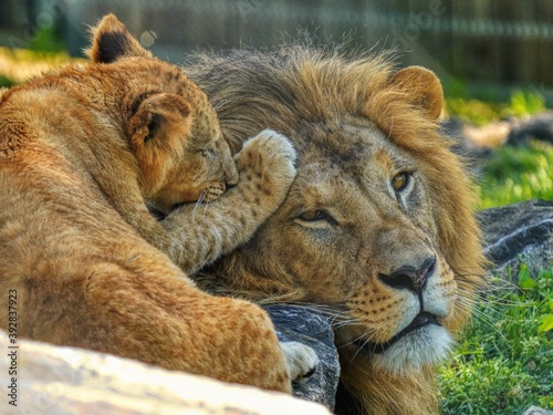 Naklejka premium lion cub and lion playing