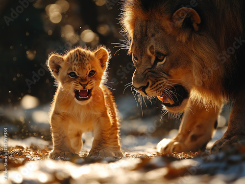 © fangphotolia, Obraz premium Lion Cub and Male Lion in the Wild: A dramatic close-up of a lion cub and a majestic male lion facing each other in a snowy forest clearing, bathed in the warm glow of the setting sun.