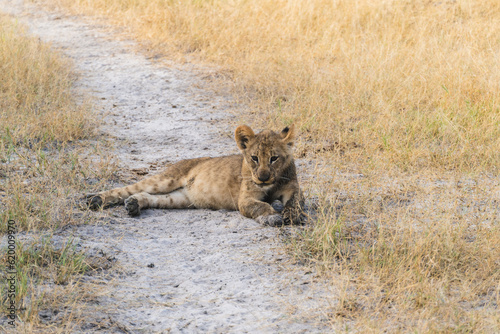 Naklejka premium lion cub laying on dirt path