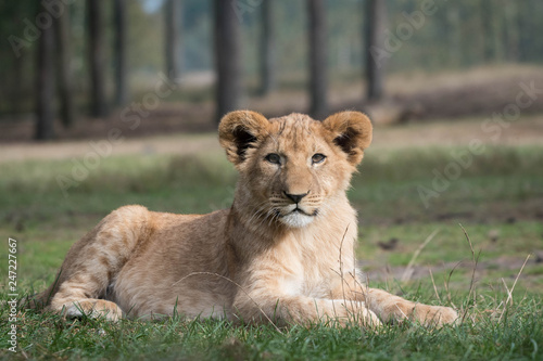 © Dennis, Fototapeta premium Lion cub laying on the grass