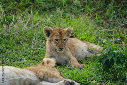 © Soaps, Naklejka premium lion cub panthera leo laying in the grass of the serengeti national park
