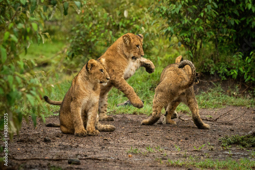 © Nick Dale, Naklejka premium Lion cub sits beside two others playing