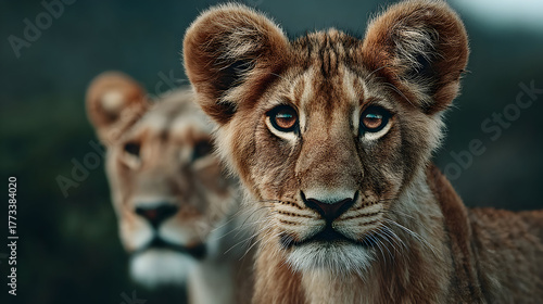 © antusher, Fototapeta premium Lion cub stares intently with mother lioness blurred in the background in natural habitat