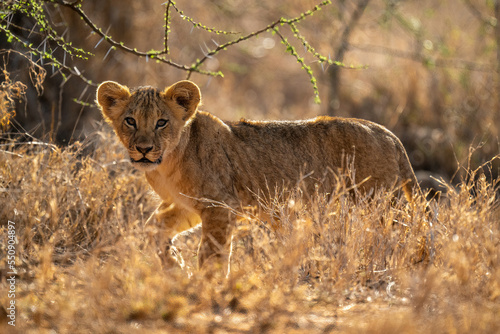 © Nick Dale, Obraz premium Lion cub walks through grass watching camera