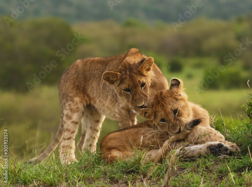 © fusebulb, Naklejka premium Lion cubs playing and grooming in Masai Mara