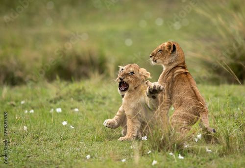 Fototapeta premium Lion cubs playing in Savannah, Masai Mara, Kenya