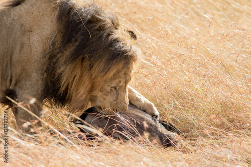 © AhmedElSheikh, Naklejka premium Lion Eating a Prey in Masai mara