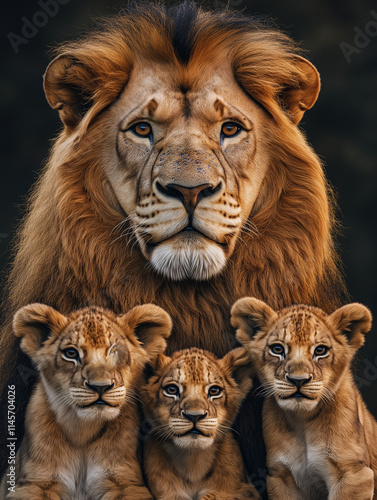 © Nayy, Fototapeta premium Lion Family Background. AI Generated