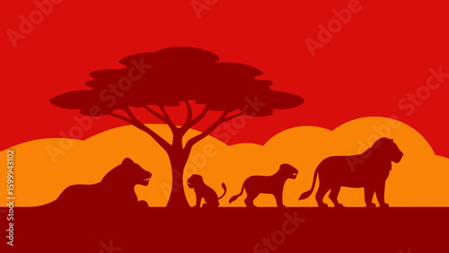 Naklejka premium Lion Family Resting Under Acacia Tree at Sunset