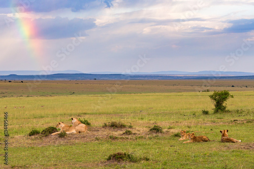 Obraz premium Lion flock in the savanna with a rainbow and rain clouds