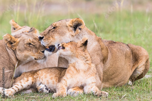 Fototapeta premium Lion Flock with a playful lion cub resting on the savanna