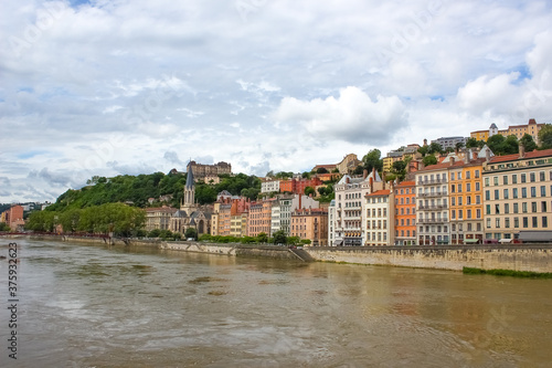 Obraz premium Lion, France - View from river Sona to the bridge and Lyon city