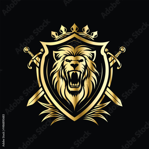 Obraz premium Lion head coat of arms with golden shield, crossed arrows and crown. Heraldic vector design element. Retro style label, heraldry logo. Luxury lion head logo template.