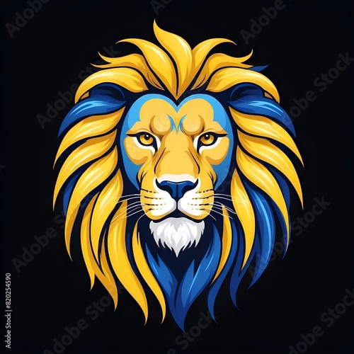 Obraz premium lion head logo vector with sharp blue and yellow mane, lion head logo on black