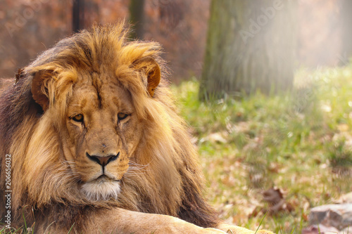 Naklejka premium Lion in forest with sun shine