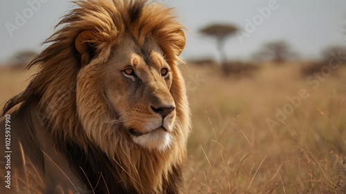 Fototapeta premium lion in the African savanna, with the wind blowing its mane."