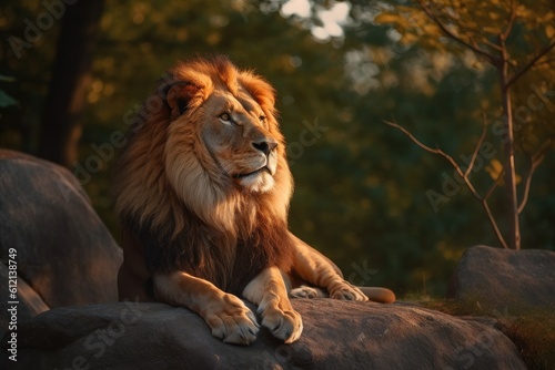 Naklejka premium Lion in the sunset in the wilderness in Africa, made with generative ai