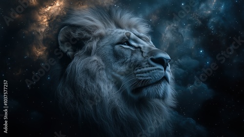 © vannet, Naklejka premium Lion king in outer space. Lion on space background