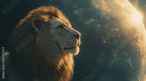 © vannet, Naklejka premium Lion king in outer space. Lion on space background