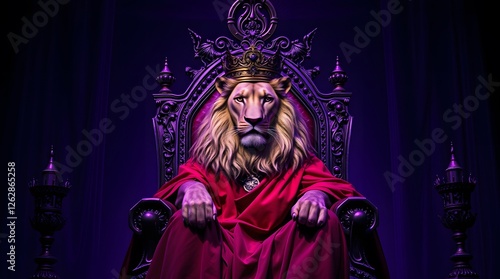 © Rifki Fachrudin, Fototapeta premium Lion King Sitting on Throne Wearing Crown and Red Cape