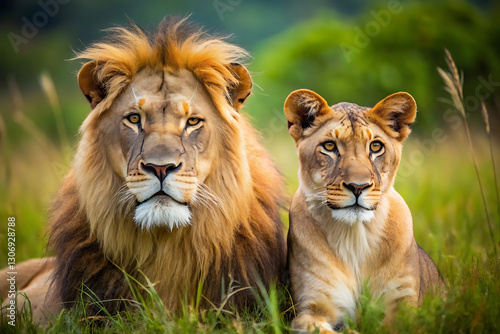 © masud, Fototapeta premium lion lioness on safari blur backdrop