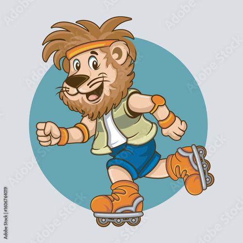 © teddy_aka, Naklejka premium Lion mascot playing roller skates