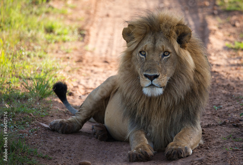 © kubikactive, Naklejka premium Lion on the savannah road in morning light