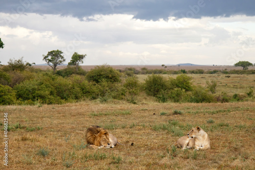 Fototapeta premium Lion (Panthera leo) love couple spending several days together on the plains of the Masai Mara National Reserve in Kenya