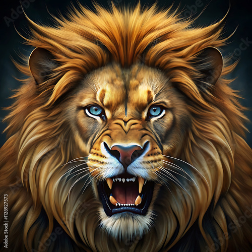 Fototapeta premium Lion portrait, fierce expression, snarling, bared teeth, glowing blue eyes