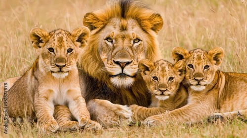 © BOJOShop, Obraz premium Lion Pride Family Portrait with Cubs in Grass