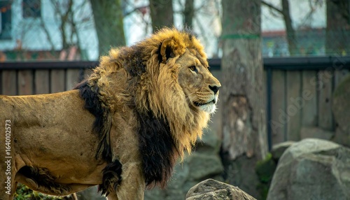Naklejka premium Lion profile in zoo setting