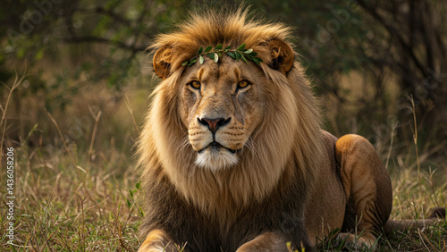 Fototapeta premium Lion Resting in Grassland with Leaf Crown Animal Portrait