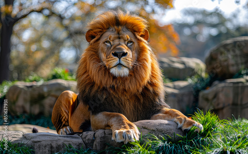 Naklejka premium Lion Resting On Rock In Zoo. A majestic lion rests on a rock in a zoo enclosure.