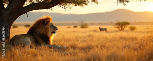 © Maryna, Obraz premium Lion rests beneath acacia tree observing distant zebra in golden savanna grassland. Majestic feline surveys territory at sunset, African wildlife, predator behavior. Warm light illuminates landscape