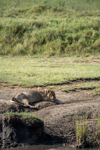 Fototapeta premium Lion rests by a water source in Serengeti National Park Tanzania