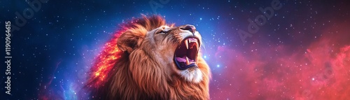 © Photo18@desing, Naklejka premium Lion roaring into a cosmic void, its mane glowing with vibrant celestial hues