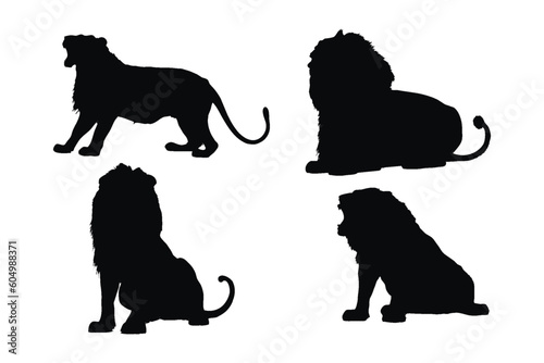 Obraz premium Lion roaring silhouette vector on a white background. Wild lion silhouette set vector. Male lion silhouette bundle design. Carnivore animals sitting in different positions silhouette collection.