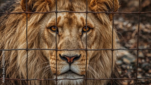 © MetaPixel, Naklejka premium Lion's face captured through a mesh barrier