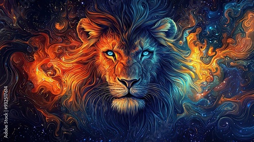 © Dragon, Naklejka premium Lion's Face Emerging from Abstract Cosmic Flames