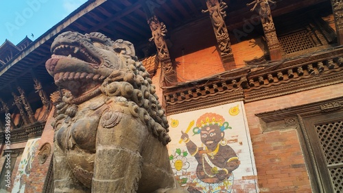 © sumit, Fototapeta premium Lion Statue Guarding Temple at Patan Durbar Square, UNESCO World Heritage Site in Nepal