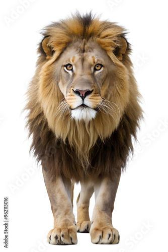 © Maestro, Obraz premium Lion strides confidently in sunlight, cut out transparent