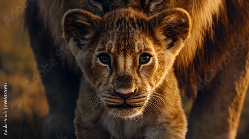 Fototapeta premium Lion Walking with Cub in Nature, Realistic Photo, Wallpaper, Cover and Screen...
