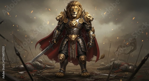 © Ayi, Fototapeta premium Lion Warrior Standing Victorious on Battlefield with Sword and Red Cape