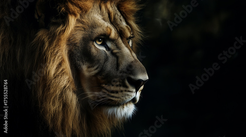 © Pakhnyushchyy, Fototapeta premium lion with fluffy mane looking away in savanna. Detail face lion.