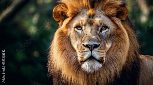 © Pakhnyushchyy, Fototapeta premium lion with fluffy mane looking away in savanna. Detail face lion.