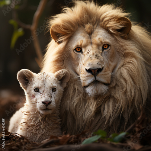 © Daniel, Fototapeta premium Lion with lamb in autumn forest