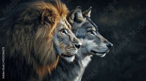 Fototapeta premium Lion Wolf Side By Side Portrait